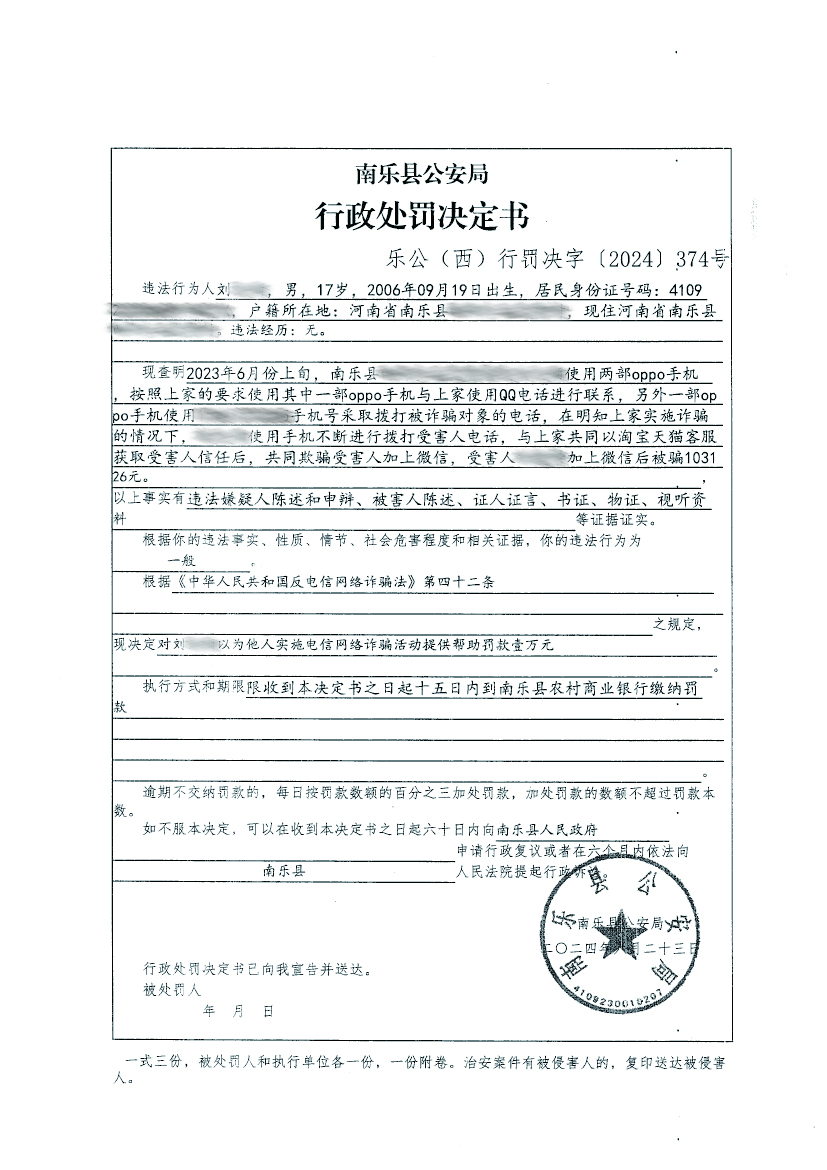 南乐县公安局关于对刘某网络诈骗提供帮助行政处罚决定书