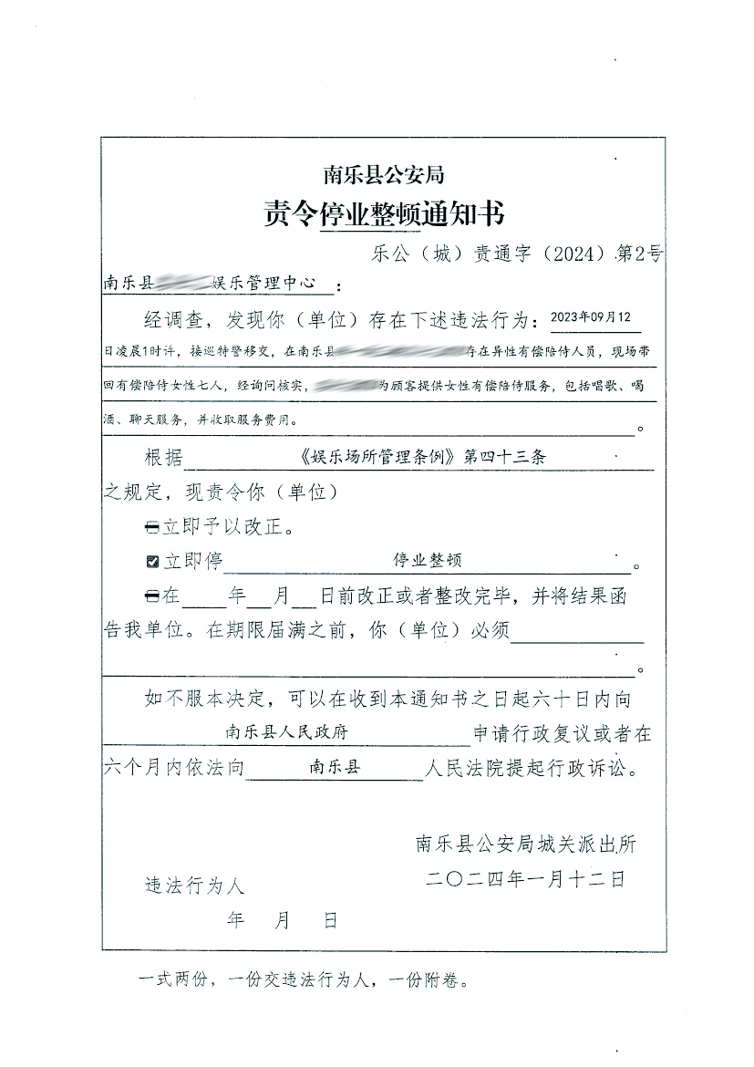 南乐县公安局关于对南乐县某某娱乐管理中心责令停业整顿通知书